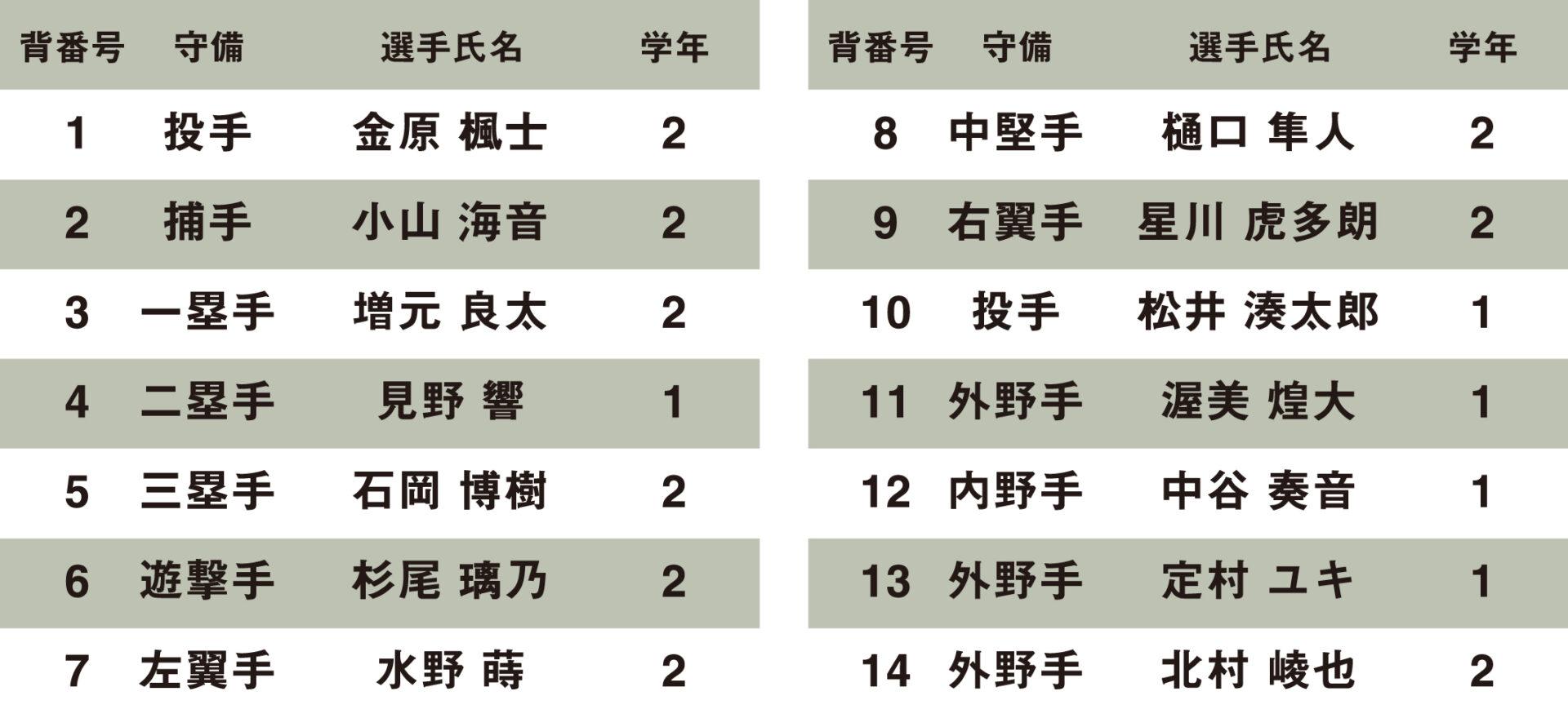 ■大会に向けての目標 強打と俊足を武器に、果敢に先の塁を狙う「攻撃野球」が持ち味です。長打でチャンスを広げ、走塁で流れを呼び込みます。 西部大会出場の喜びを胸に、試合ごとに成長を重ね、一体感ある戦いで頂点を目指します。