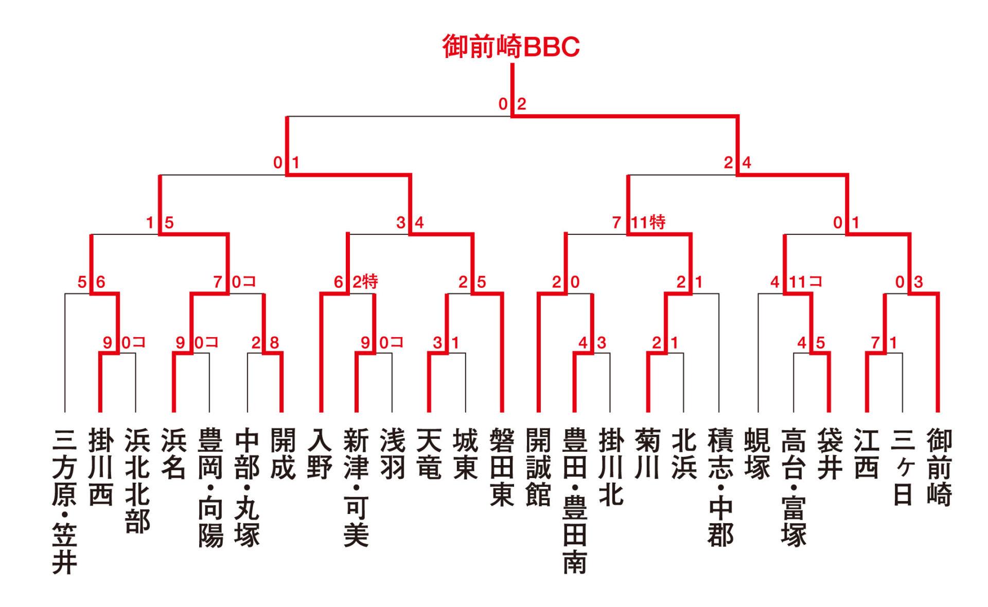 磐田東と御前崎が対戦した決勝戦。先攻の磐田東の先頭打者が初球を叩くとレフト前へ。先制点が欲しい所だったが後続がダブルプレーに倒れ得点ならず。両者無得点で迎えた2回裏。一死から四球を選ぶと、続く打者が右中間へ運び、一死二塁、三塁のチャンスを作ると、内野ゴロの間に三塁ランナーが生還し、御前崎が1点を先制。さらに続く打者が初球スクイズを決め、さらに1点を追加。その後は両投手が好投し、2対0と御前崎リードのまま最終回へ。磐田東は一死からヒットと四球でランナーを出すも後続が倒れ「ゲームセット」。2対0で御前崎が磐田東を下し、西部王者に輝いた。