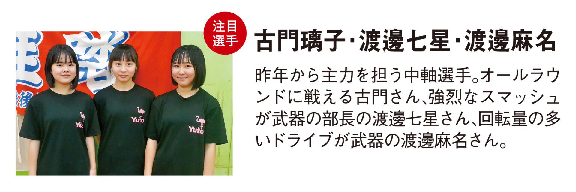 昨夏、全国大会出場を果たした雄踏中学校女子卓球部。今年もその強さは健在。新人戦浜松地区大会では絶対王者の浜松修学舎中学校を退け優勝。西部大会、県大会では決勝で敗れ準優勝となったが、全国選抜大会への出場を果たした。